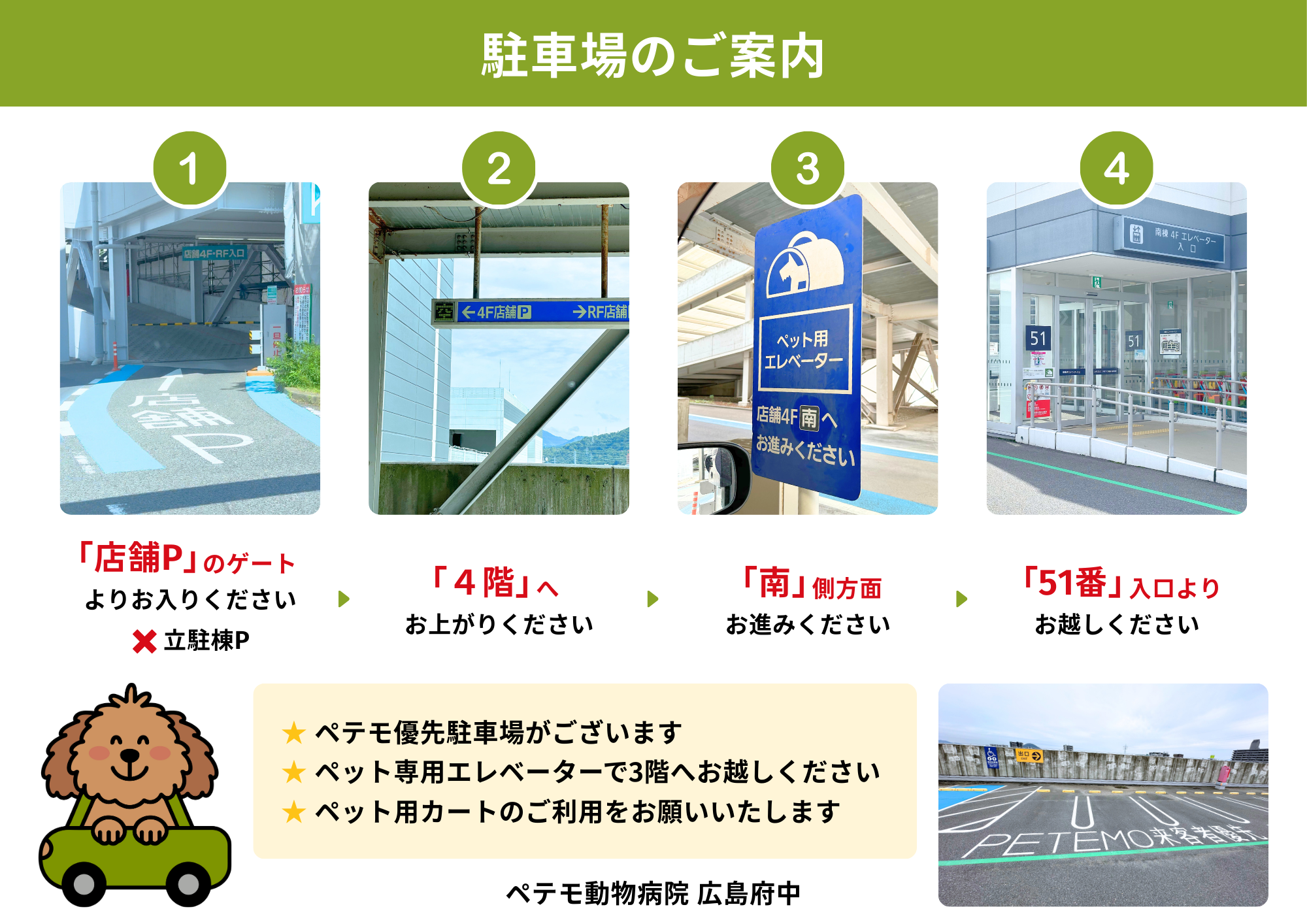 ペットをお連れの方はイオンモール広島府中のペット同伴ルートからご来院ください。