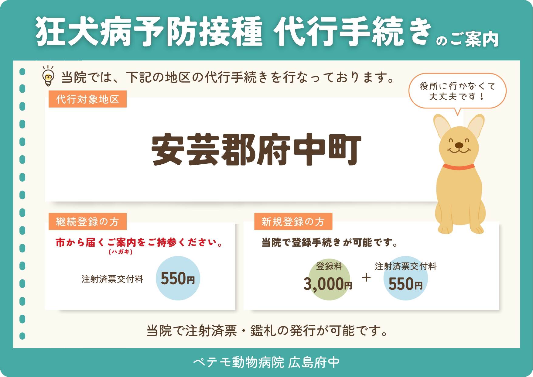 - 〇安芸郡府中町にお住まいで狂犬病接種をされた方は当院にて犬の登録・鑑札の交付・注射済票の交付を受けられます。