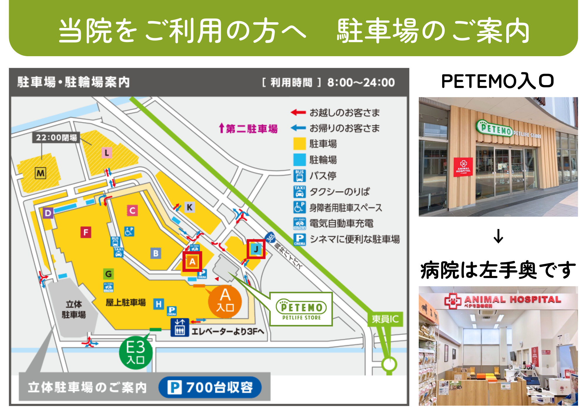 - 〇「PETEMO」というイオンペットの運営するペットショップとトリミング・ホテル施設が隣接しており、 診察後にペットの必要なものを購入して帰ることも可能です。